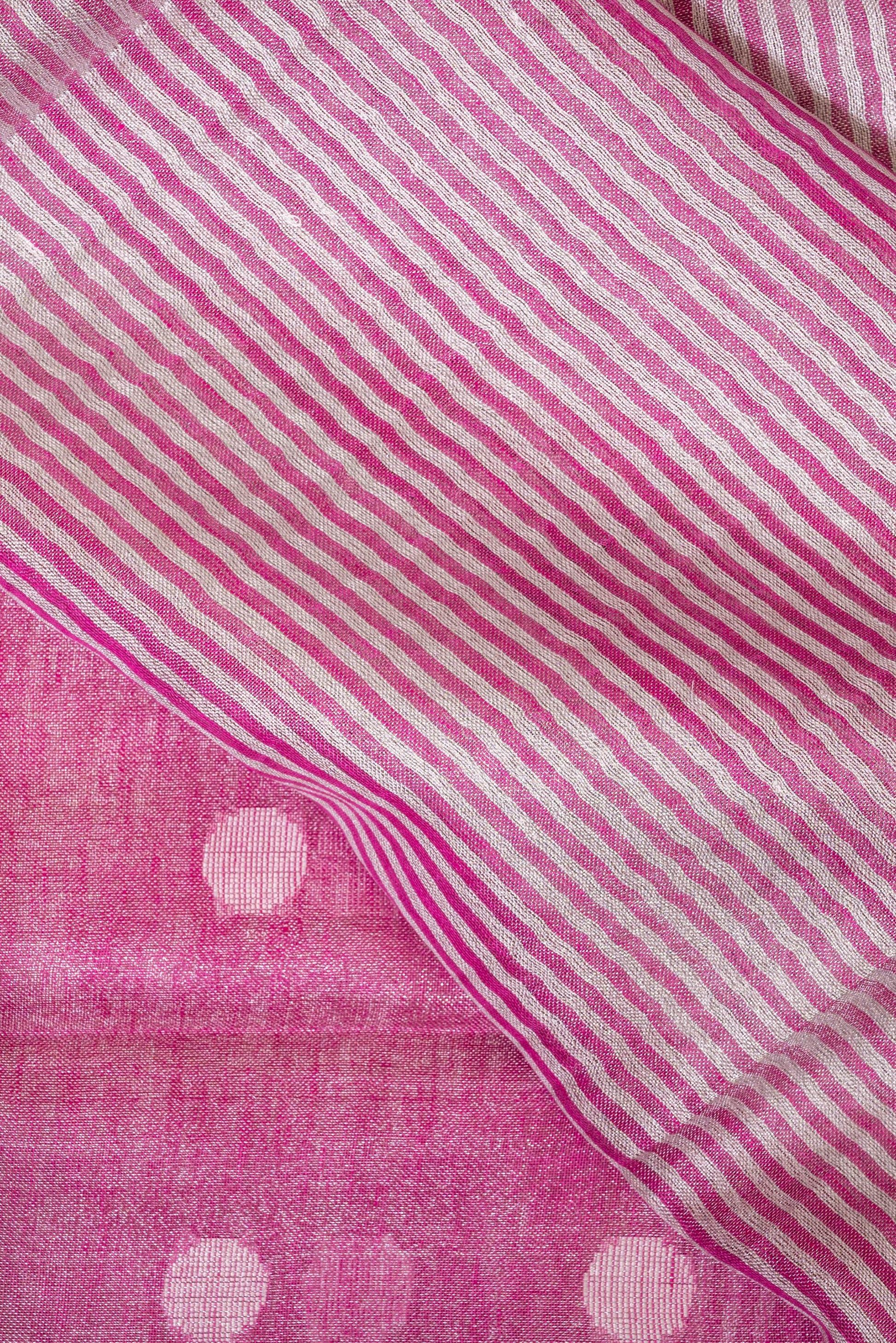 This pink handwoven linen tissue sari, adorned with silver booti work, exudes timeless sophistication. With Adaa, embrace natural beauty and elegance in every drape.